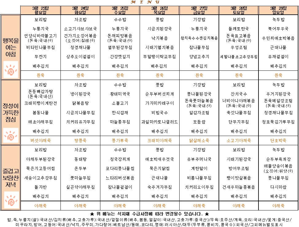 3¿ù 23ÀÏ~3¿ù 29ÀÏ ½Ä´ÜÇ¥ÀÔ´Ï´Ù